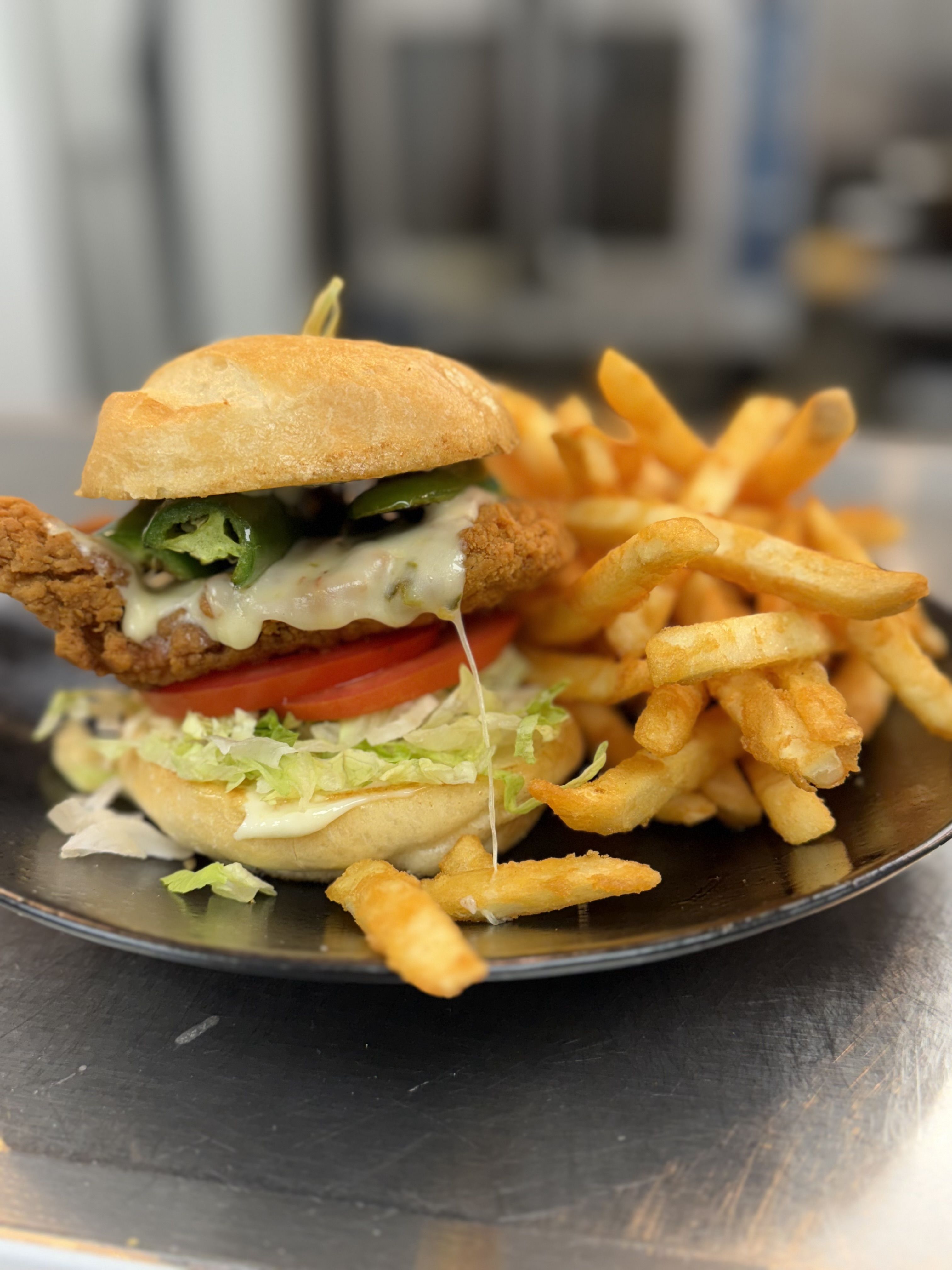 Breaded and fried chicken, grilled jalapenos, pepper jack cheese, chipotle ranch, lettuce, tomato and onion with your choice of salad or french fries