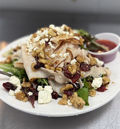 Turkey, Feta, Candied Walnuts, Dried Cranberries, TOmato, GF Raspberry Dressing