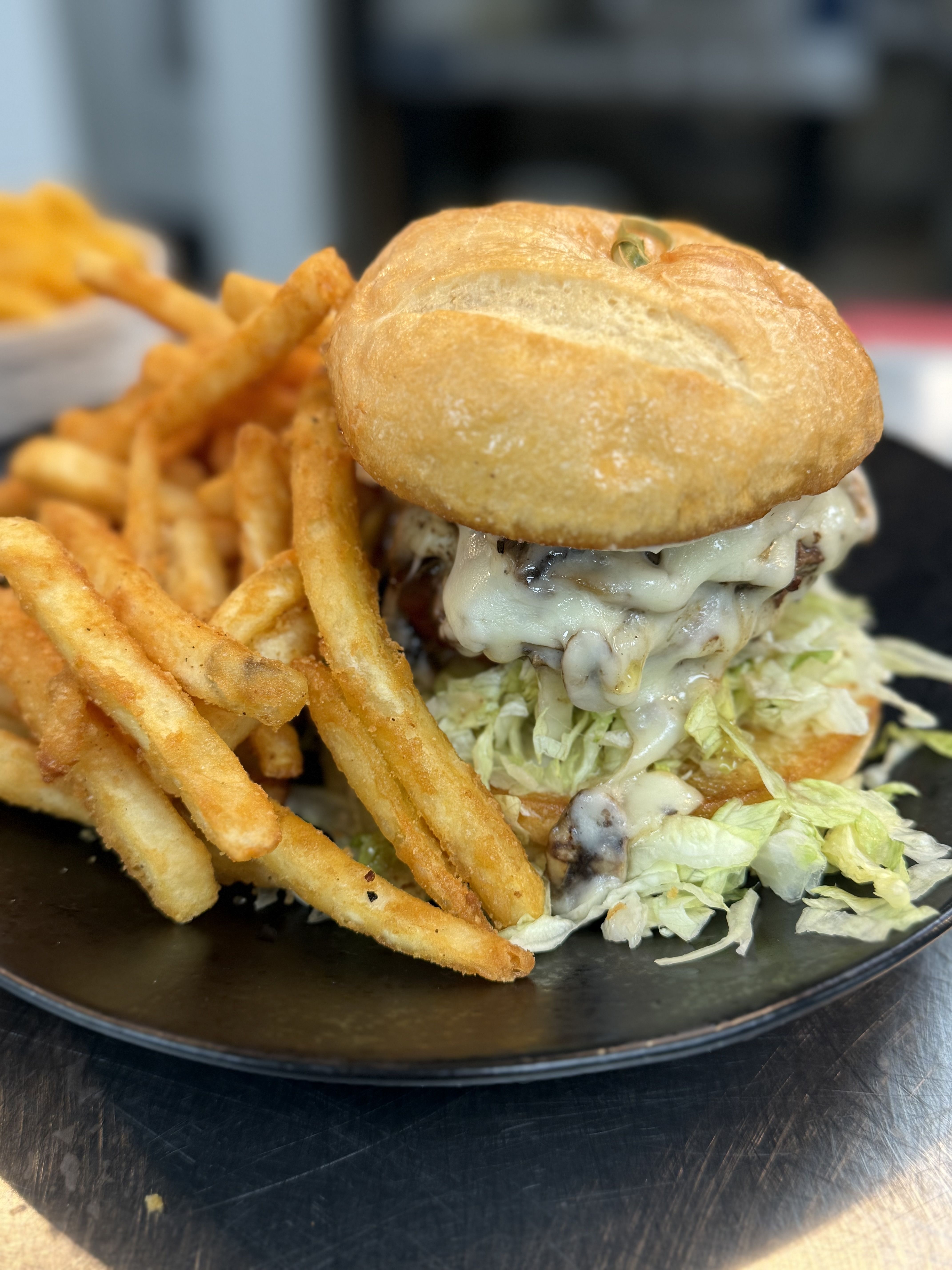 2 1/4lb fresh ground beef patties, w/Swiss Cheese, Smothered in Grilled Mushrooms, Mayo, Lettuce, Tomato
